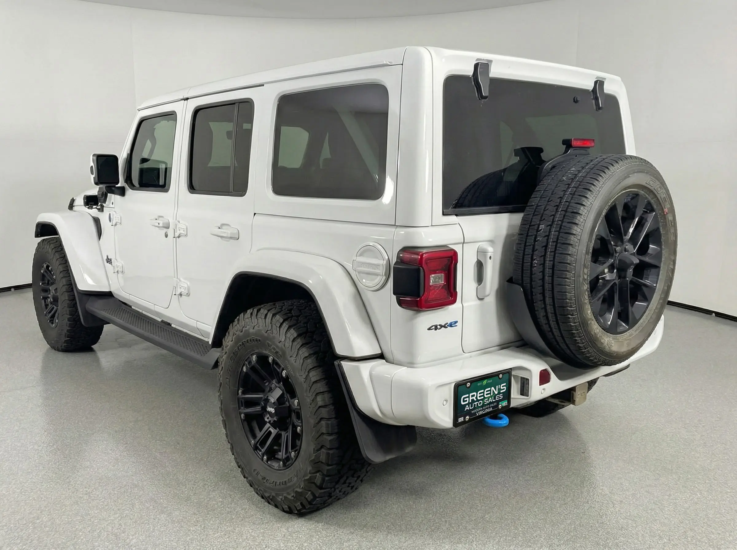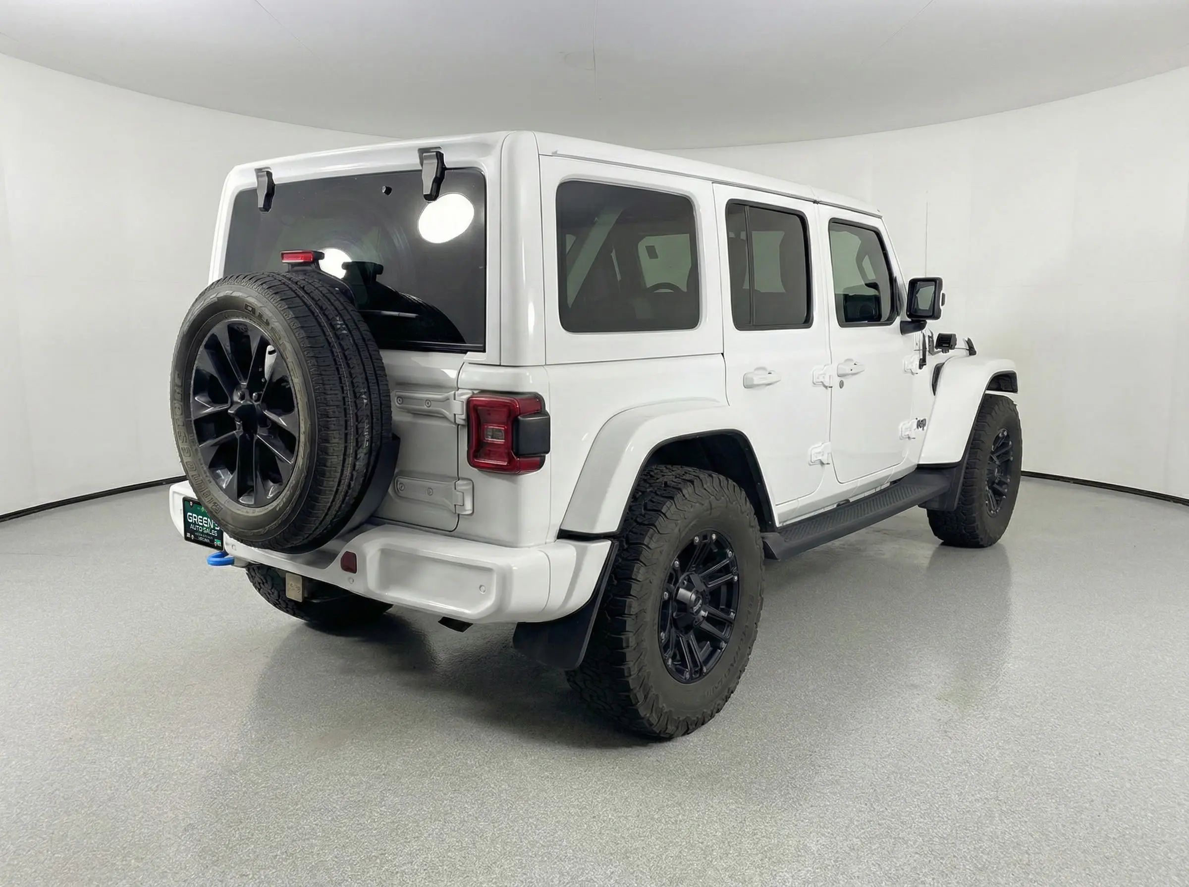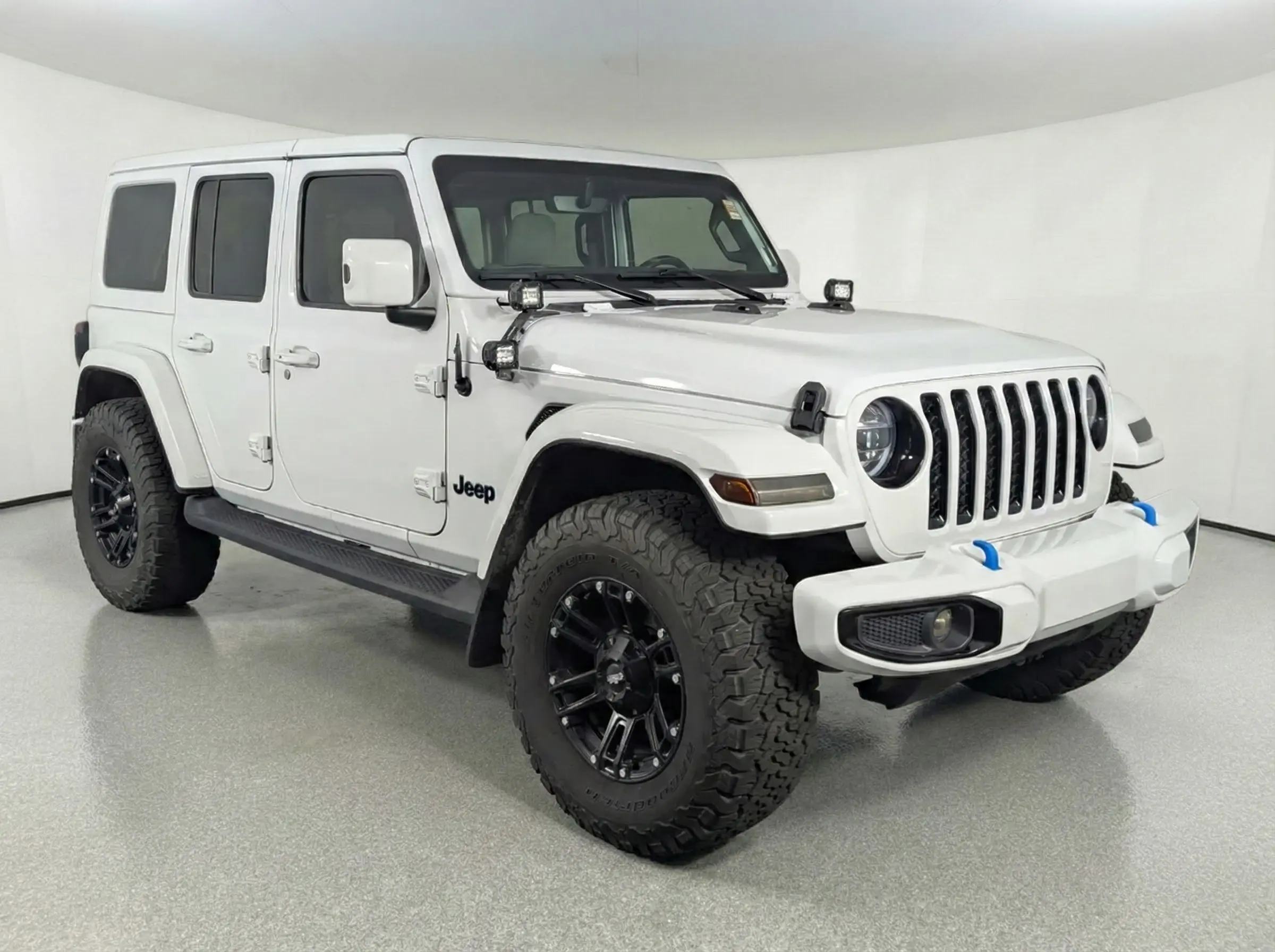 2021 Jeep Wrangler Unlimited Sahara High Altitude 4xe represents the cutting edge of off-road capability and electrified efficiency. Finished in Bright White Clearcoat with Blue Tow Hooks, this plug-in hybrid is powered by a 2.0L I4 DOHC Turbocharged engine paired with an 8-Speed Automatic 4WD system.